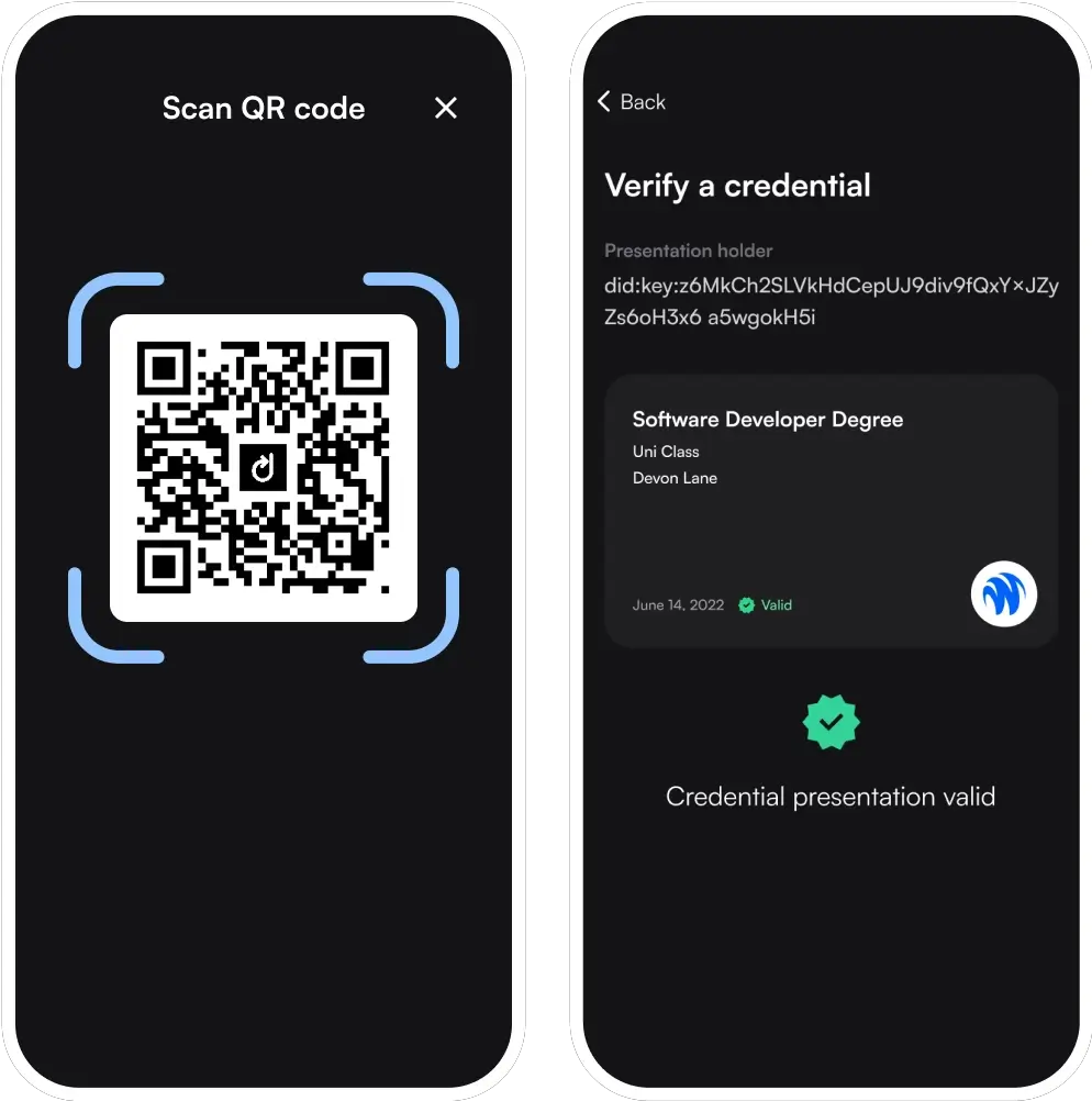 Create Verification Requests and send Verification QR Codes to your users. They’ll scan them with their Digital ID Wallet app and you’ll receive instant confirmation of the credentials’ authenticity.