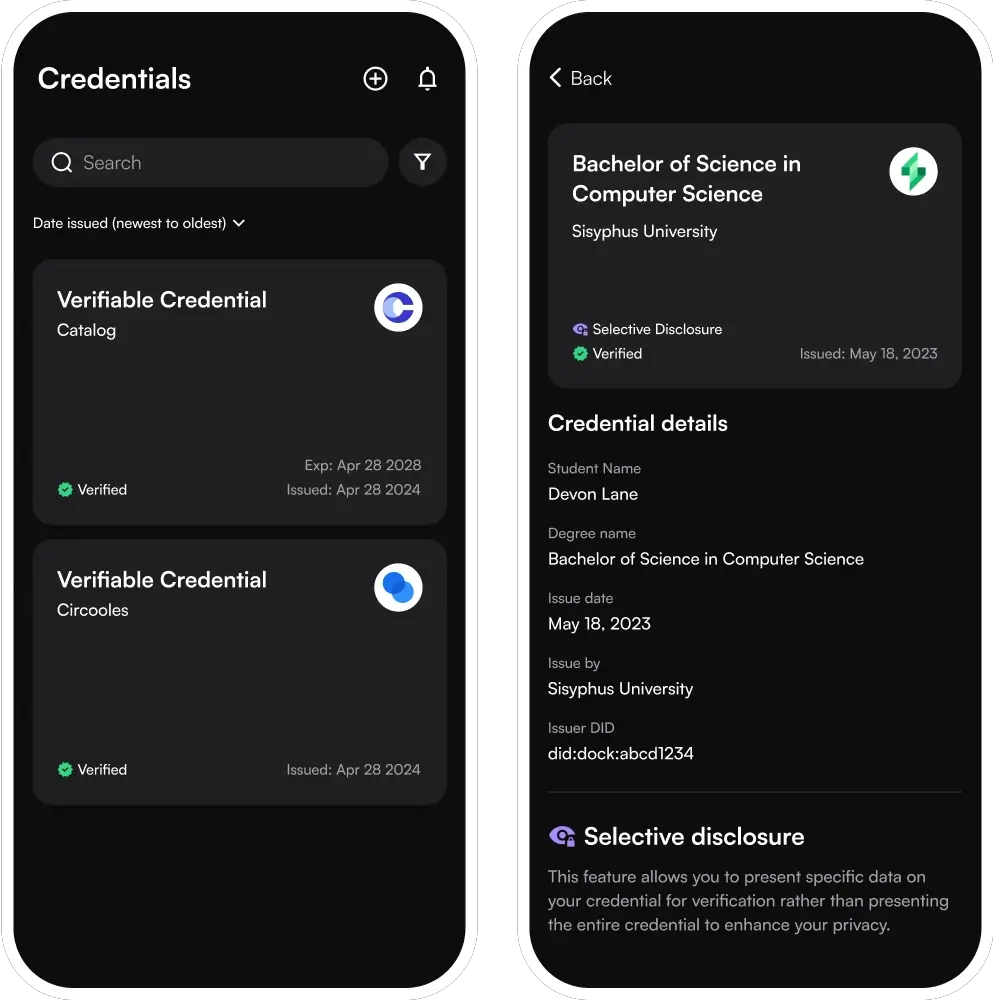 Build ID wallet capabilities inside your existing app with Dock’s powerful Wallet SDK. Users can manage and share their Reusable Digital ID credentials without having to download an extra app.