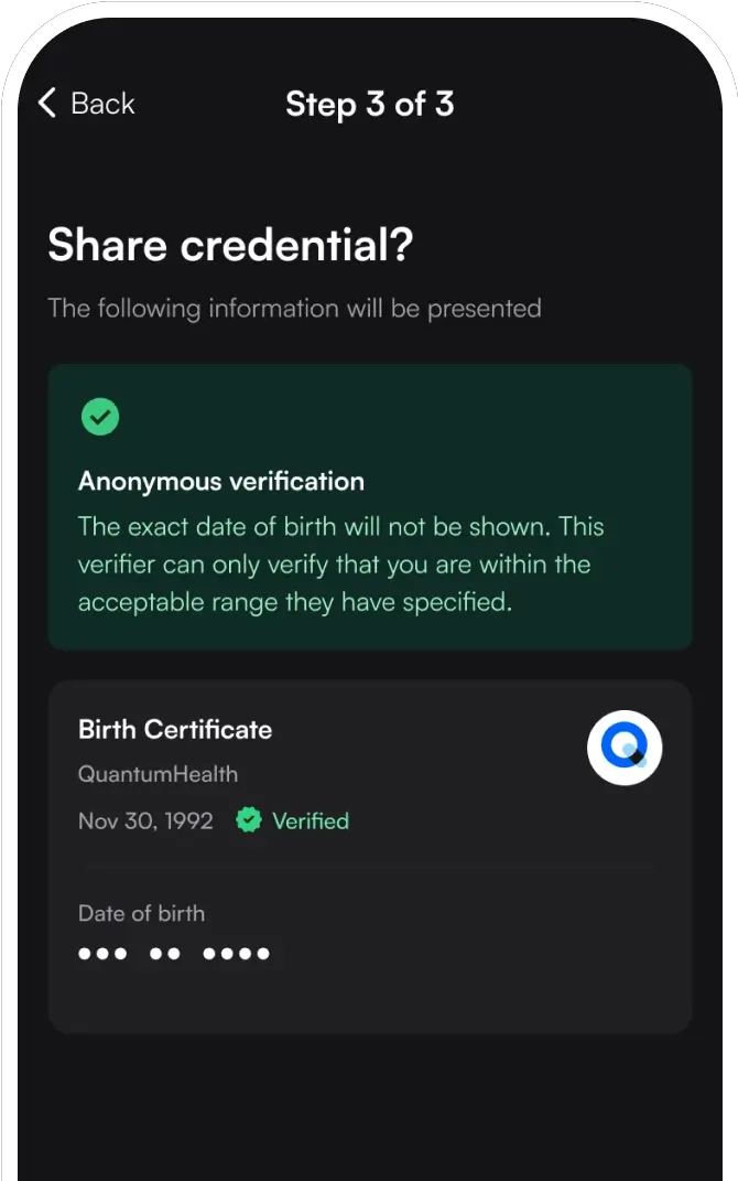 Combine compliance with data privacy. When submitting a credential for verification, users can prove something about themselves without revealing the data that backs up the proof. For example, a user can prove she is over 18 without showing her birthdate or age.