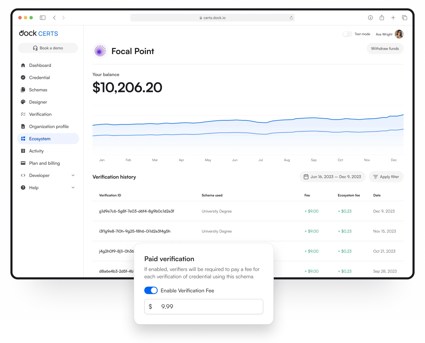 Dock’s user-friendly web dashboard and API allow you to invite and manage trusted issuers and verifiers. Simplify the process of identifying which issuers and verifiers are trustworthy within a particular ecosystem.
