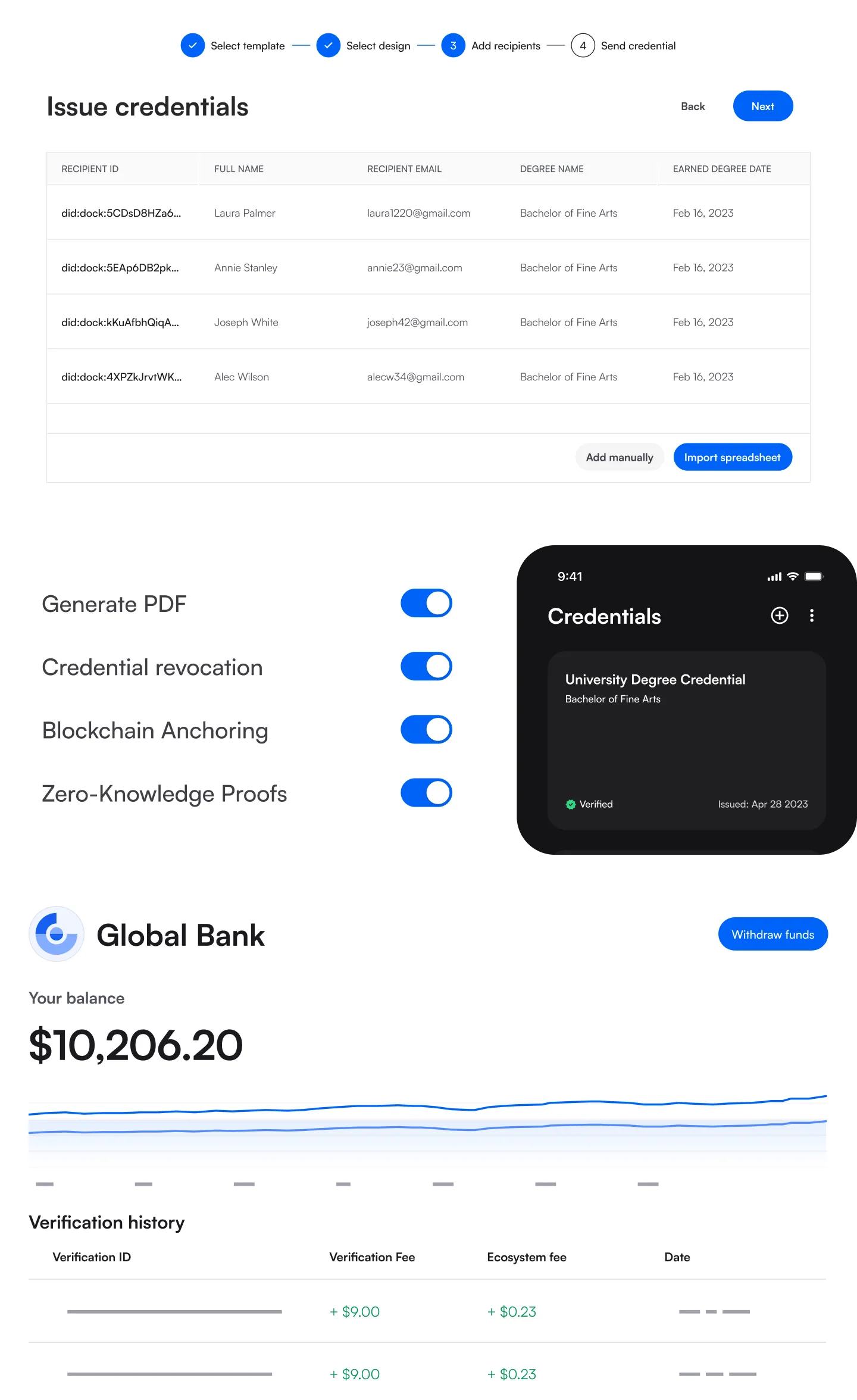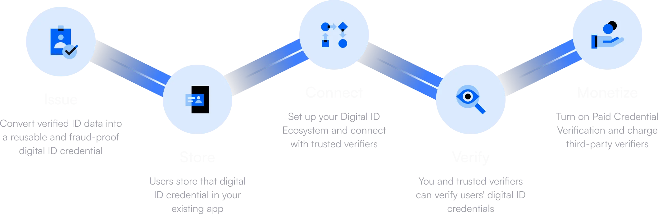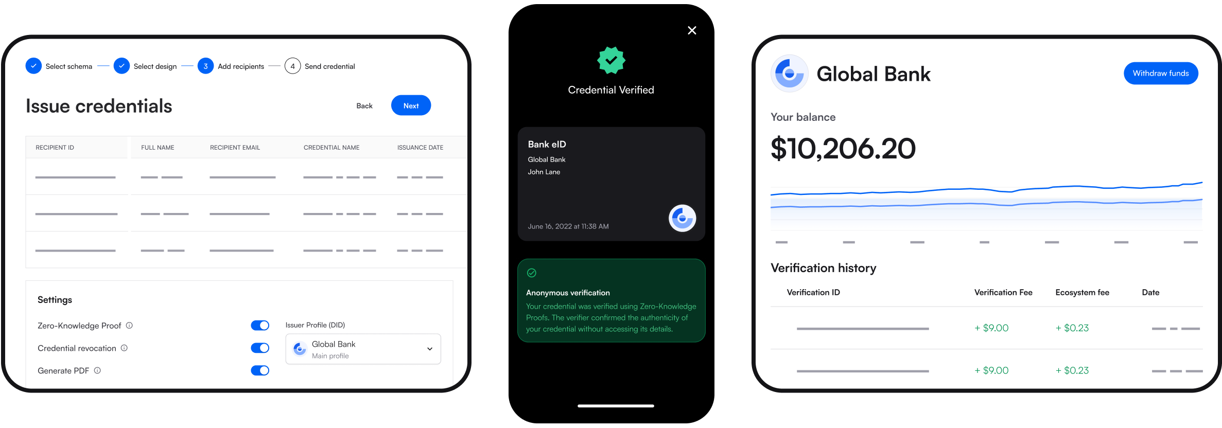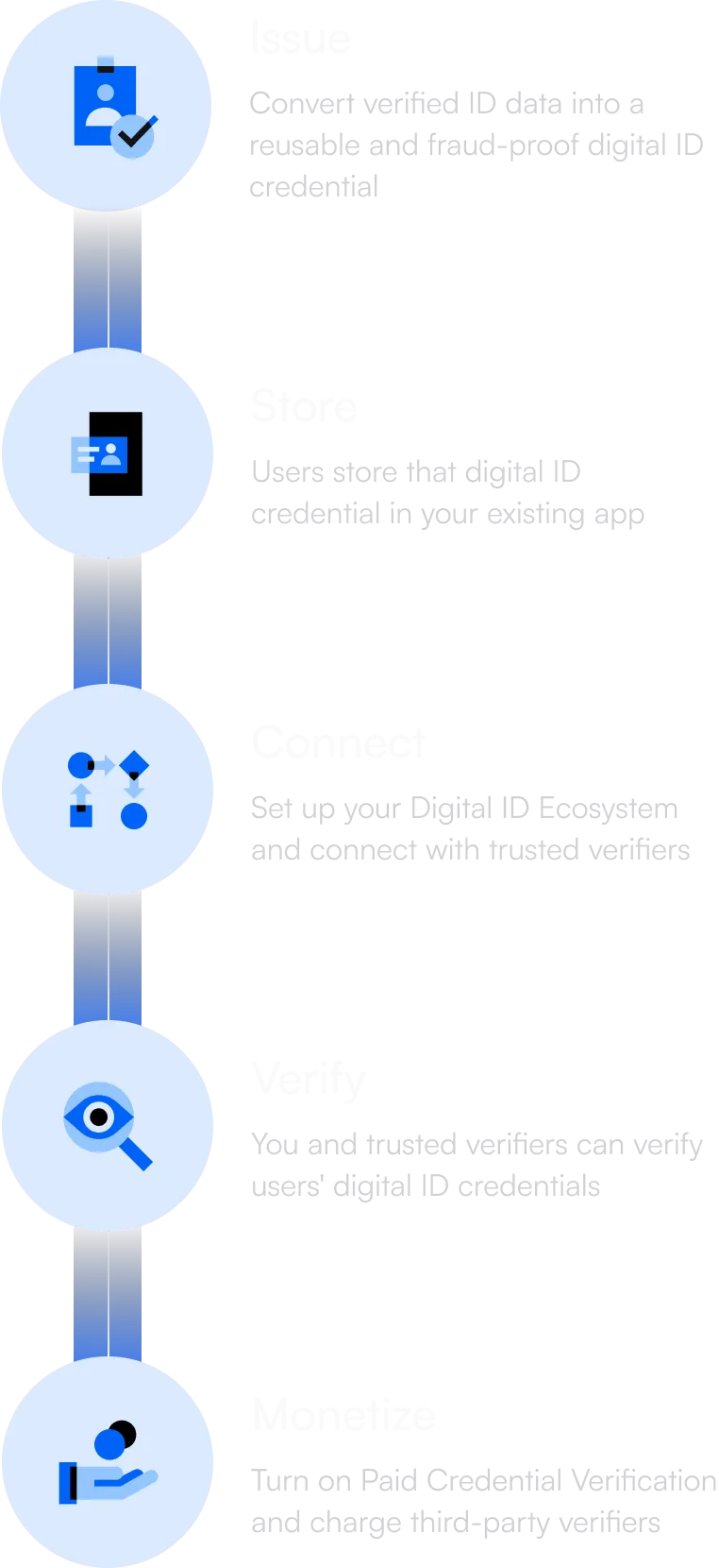 Turn verified ID data into Reusable Digital ID Credentials, instantly verify their authenticity and get paid when they are verified by third parties.